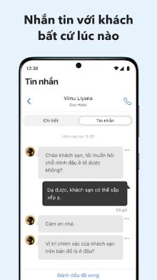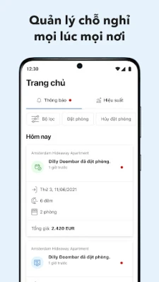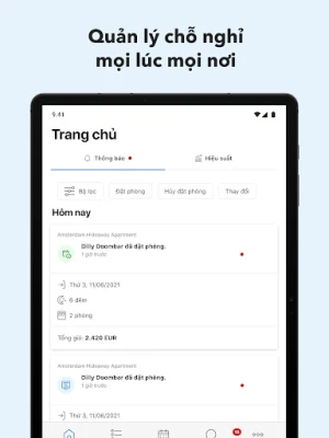 Luôn nắm bắt mọi diễn biến quan trọng trong ngày với các cập nhật tức thì. Từ những đặt phòng mới, các yêu cầu trả/nhận phòng sắp tới, đến những thay đổi chi tiết hoặc hủy đặt phòng, bạn sẽ không bỏ lỡ bất kỳ thông tin nào. Hơn nữa, ứng dụng này còn là cầu nối giúp bạn tương tác liền mạch với khách hàng. Sử dụng tính năng trò chuyện trực tiếp để phản hồi nhanh chóng mọi thắc mắc, hoặc tận dụng kho thư mẫu đa ngôn ngữ đã được dịch sẵn để giải quyết các yêu cầu phổ biến, đảm bảo trải nghiệm lưu trú của khách luôn hoàn hảo và trọn vẹn.