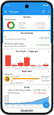 Ứng dụng cung cấp công cụ linh hoạt để bạn quản lý các tài khoản và thẻ tín dụng, cho phép tạo tài khoản ẩn cho các mục đích riêng tư hoặc kinh doanh nhỏ. Sắp xếp thu nhập và chi phí thông qua hệ thống danh mục tùy chỉnh, giúp bạn phân loại mọi giao dịch một cách thông minh. Việc nhập liệu trở nên nhanh chóng và đơn giản với các mẫu giao dịch được thiết lập sẵn, khả năng định cấu hình tài khoản mặc định và lên kế hoạch chi tiêu hay thu nhập định kỳ cùng tính năng nhắc nhở tiện lợi. **Quản lý Ngân sách chi tiêu** đảm bảo bạn luôn có cái nhìn rõ ràng về từng khoản tiền ra vào, từ đó đưa ra những quyết định tài chính sáng suốt.
